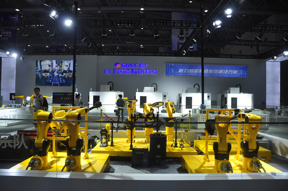 ? ? ? ? 如果工業(yè)化集成應(yīng)用區(qū)的展出產(chǎn)品更受智能裝備專業(yè)人士的歡迎,那么格力工業(yè)機(jī)器人樂隊則引來了眾多普通參展者的圍觀。一群外形精致,身手靈活的“小黃人”成為格力展區(qū)上的“明星”。它們有的打鼓,有的彈琴,有的在一旁用吉他、貝斯、鐘琴伴奏,一首雄壯悠揚(yáng)的《歌唱祖國》奏響于重慶智博會。